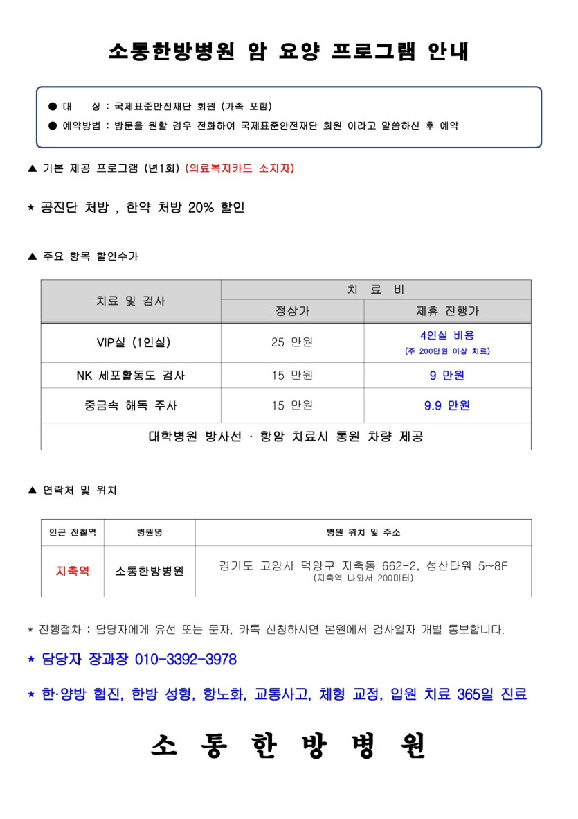 소통한방병원 암 요양 프로그램 안내 등록일2025.09.10 조회수422 . 댓글 0댓글쓰기 댓글목록 등록된 댓글이 없습니다. 이전글 복지몰 오픈 안내 다음글 강사님 보수교육안내 목록