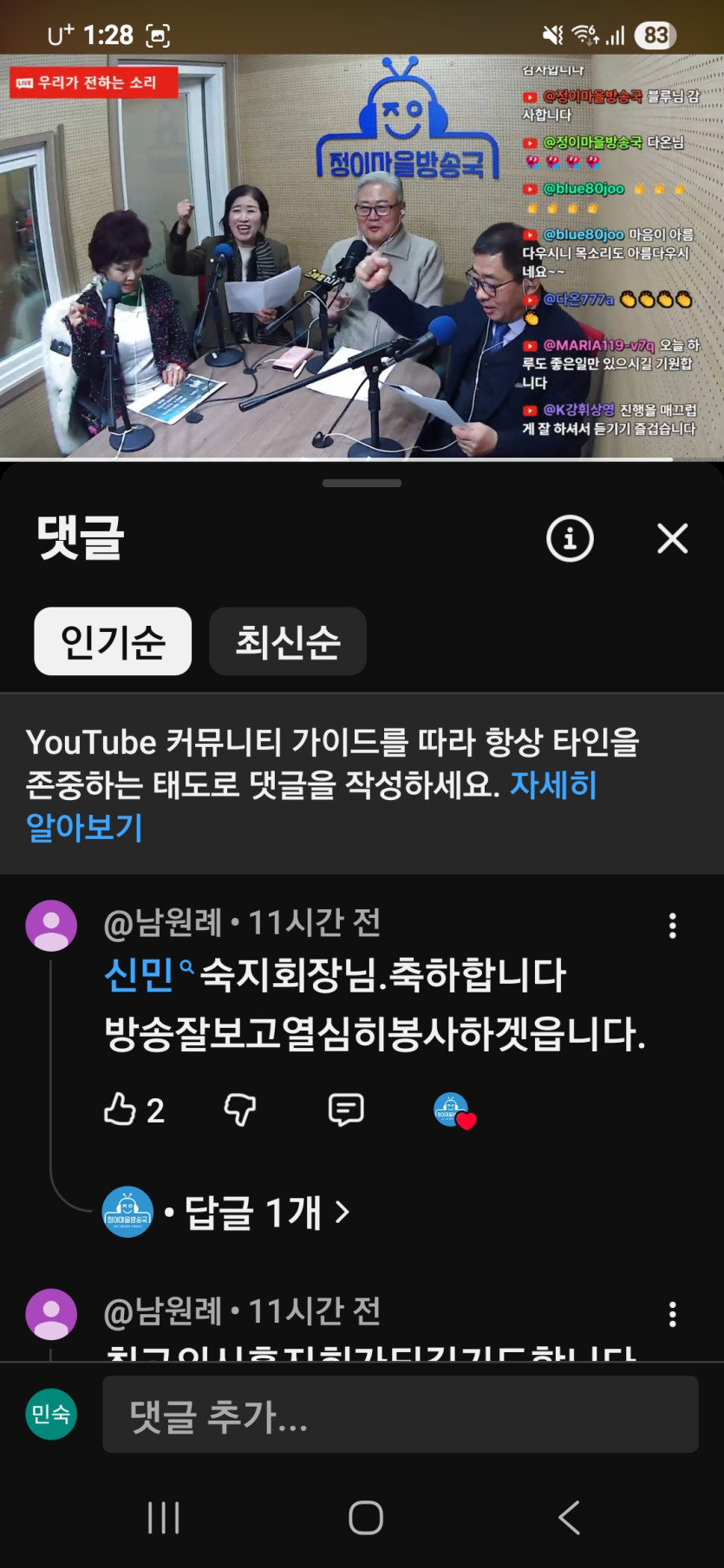 시흥시에만 있는 정이방송 등록일2026.01.22 조회수15 또시흥시에만 있는 정이방송에 라이브로 출현하여 국제표준안전재난봉사회로 출현하여 각종 봉사활동사진과 선서문 구호제창으로마무리 하면서 국제재난봉사대의 위상을 업했습니다 유튜브에 정이방송으로들어가심 되고요 전국 세계로 다 방송된다고합니다 댓글 0댓글쓰기 댓글목록 등록된 댓글이 없습니다. 이전글 이전 글이 없습니다. 다음글 제1회 엘르 파크골프배 아시안컵 목록